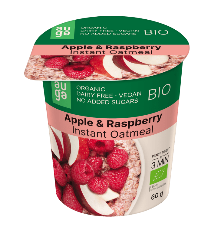 Fruity and vibrant — Auga Oatmeal with Apples & Raspberries (Bio) is a wholesome organic instant oatmeal made with whole grain oats, naturally sweet apples, and tangy raspberries. Rich in fiber and full of fruity flavor, it offers a quick, balanced, and refreshing start to the day.